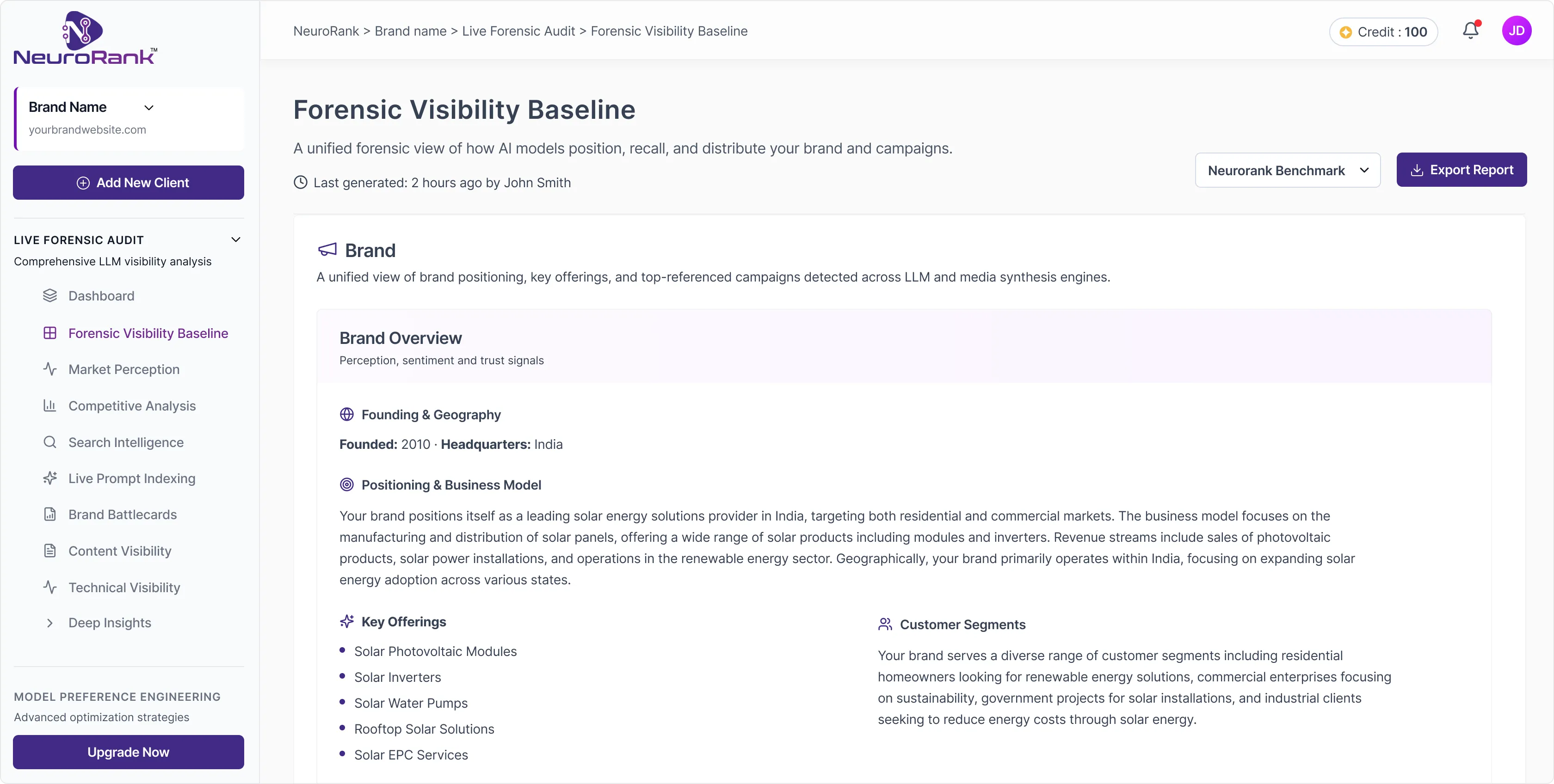 NeuroRank’s marketing agent crawls your website and public digital presence. It identifies trust signals, captures information on your brand positioning, customer segments, product offerings, and company data. It creates an initial trust signal probe - the baseline that all subsequent LLM responses are measured against.